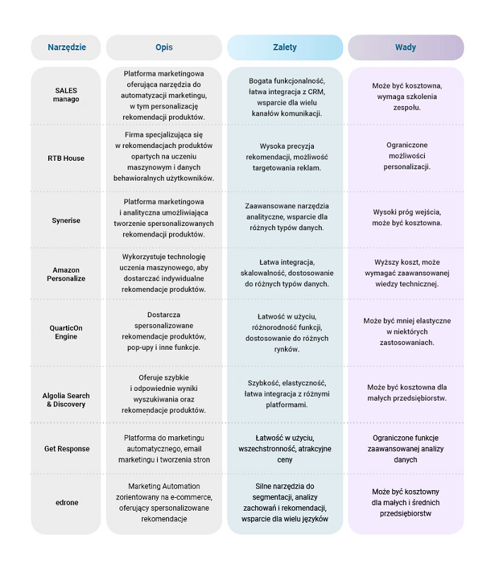Na rynku istnieje wiele narzędzi silników rekomendacji produktów, które reprezentują różne podejścia