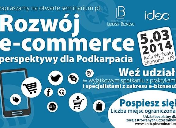 Dnia 5 marca 2014 r. w Auli Wydziału Ekonomii Uniwersytetu Rzeszowskiego, odbyło się otwarte seminarium "Rozwój e-commerce - perspektywy dla Podkarpacia". Prelegenci przeanalizowali możliwości i szanse dla rozwoju firm naszego regionu, jakie niesie za sobą wykorzystanie e-commerce.