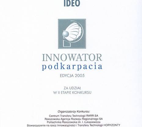 W tegorocznej edycji konkursu Innowator Podkarpacia, firma Ideo znalazła się w ścisłej czołówce firm, przechodząc do drugiego etapu. Dyplom z rąk Marszałka Województwa Podkarpackiego Leszka Deptuły odebrał Dyrektor Generalny Ideo Arkadiusz Michno.