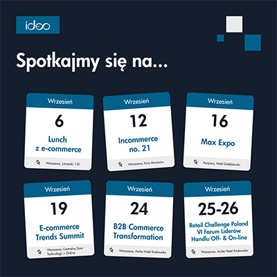 Wrzesień w Ideo zapowiada się jako jeden z najbardziej intensywnych miesięcy w roku. Nasz zespół będzie brał udział w szeregu ważnych wydarzeń związanych z e-commerce. Będzie to doskonała okazja do wymiany wiedzy, poznania najnowszych trendów i nawiązania nowych kontaktów.
