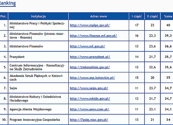 Serwis www.mpips.gov.pl został doceniony m.in. za czytelną strukturę, kategoryzującą informacje oraz pozwalającą na ich szybkie wyszukiwanie. Zaletą strony – w ocenie Fundacji - są również dodatkowe nawigacje pozwalające na bezpośrednie przejście użytkownika korzystającego z programu czytającego do menu głównego, podmenu oraz treści strony.