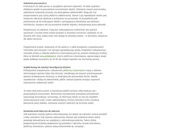 E-learning jest nie tylko pomocą w zarządzaniu sprawami obywateli. To również wygodny oraz efektywny sposób na prowadzenie wewnętrznych szkoleń, wprowadzanie nowych pracowników, odświeżanie znajomości procedur czy obowiązkowe szkolenia BHP - mogą być przeprowadzone przy użyciu platformy elektronicznej.