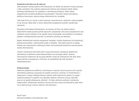 Rzetelnie przygotowane platformy e-learningowe mogą być bardzo dużą pomocą dla organów administracji publicznej, zaczynając od urzędów gminnych, a kończąc na ministerstwach i instytucjach o zasięgu międzynarodowym. Bardzo często zapomina się jednak, że urzędy i instytucje publiczne charakteryzują się zupełnie inną charakterystyką działania, odmiennymi procesami, specyfiką prawną czy sposobem obsługi „klientów”. To również odmienne potrzeby oraz oczekiwania użytkowników. O sukcesie wdrażania innowacji de facto należy mówić wówczas, gdy osoby, które na co dzień pracują w danym systemie informatycznym są z niego zadowolone.