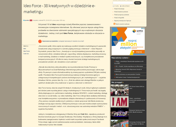 „Stworzenie spółki, która zajmie się realizacją wszelkich działań e-marketingowych usprawniło świadczenie usług związanych z szeroko pojętą promocją w Internecie” – mówi Wojciech Szymański, prezes Ideo Force. „Inwestycje w rozwój kompetencji pracowników pozwoliły na rozszerzenie oferty o działania takie jak: copywriting, reklama displayowa, marketing wirusowy, e-mail marketing, działania w mediach społecznościowych, czy kompleksowe prowadzenie kampanii promocyjnych. W ofercie mamy również tworzenie strategii marketingowych, prowadzenie szkoleń, ale i doradztwo w tym zakresie.”