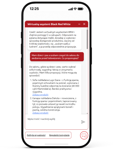 Dzięki temu wdrożony Asystent Zakupowy AI w prosty i naturalny sposób pomaga klientom znaleźć odpowiednie meble,dodatki i pozostałe produkty z oferty Black Red White – tak jak zrobiłby to doradca w salonie.